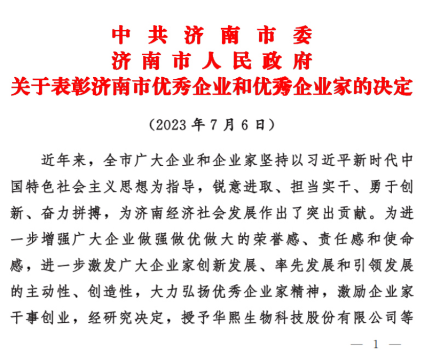 2023年7月6日,中共济南市委、济南市人民政府颁布《关于表彰济南市优秀企业和优秀企业家的决定》,我司被授予“泉城优秀企业”称号,这是对我司多年来锐意进取、担当实干、勇于创新、奋力拼搏的认可。